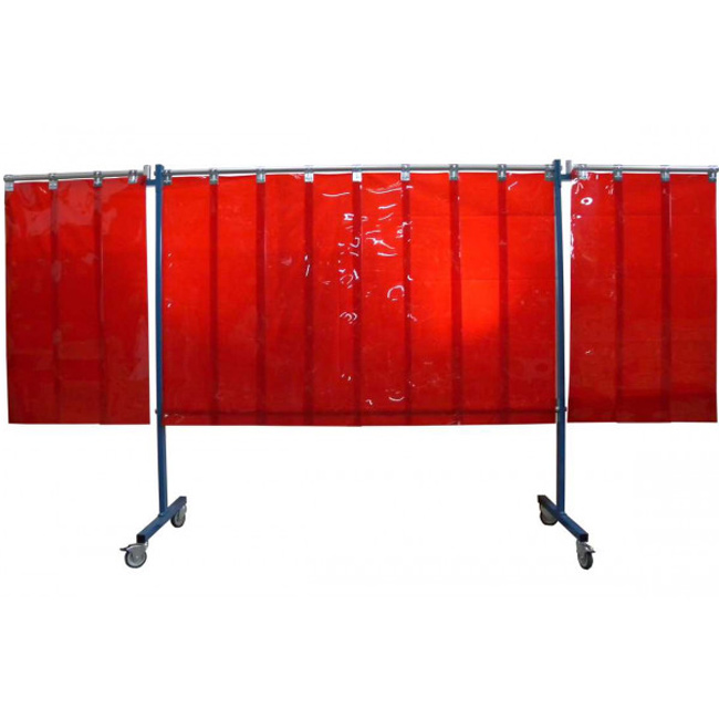Perdea protectie sudura Sinotec-Lansarc roșu-portocaliu cu fasii suprapuse. Set 5 fasii de 465×1800 mm. Dimensiune dupa montaj cu suprapunere: 1800×2000 mm. Produsul nu include suporti sau carlige de prindere.